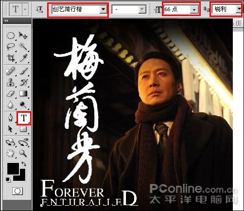 7、选择工具箱中的“横排文字工具”,在画面中用鼠标单击后,出现一个输入文字光标,再光标后输入“FOREVERENTHRALLED”字,在工具选项栏中设置字体为“创艺简行楷”,设置字体大小为“66点”,设置消除锯齿为“锐利”,如图7所示。